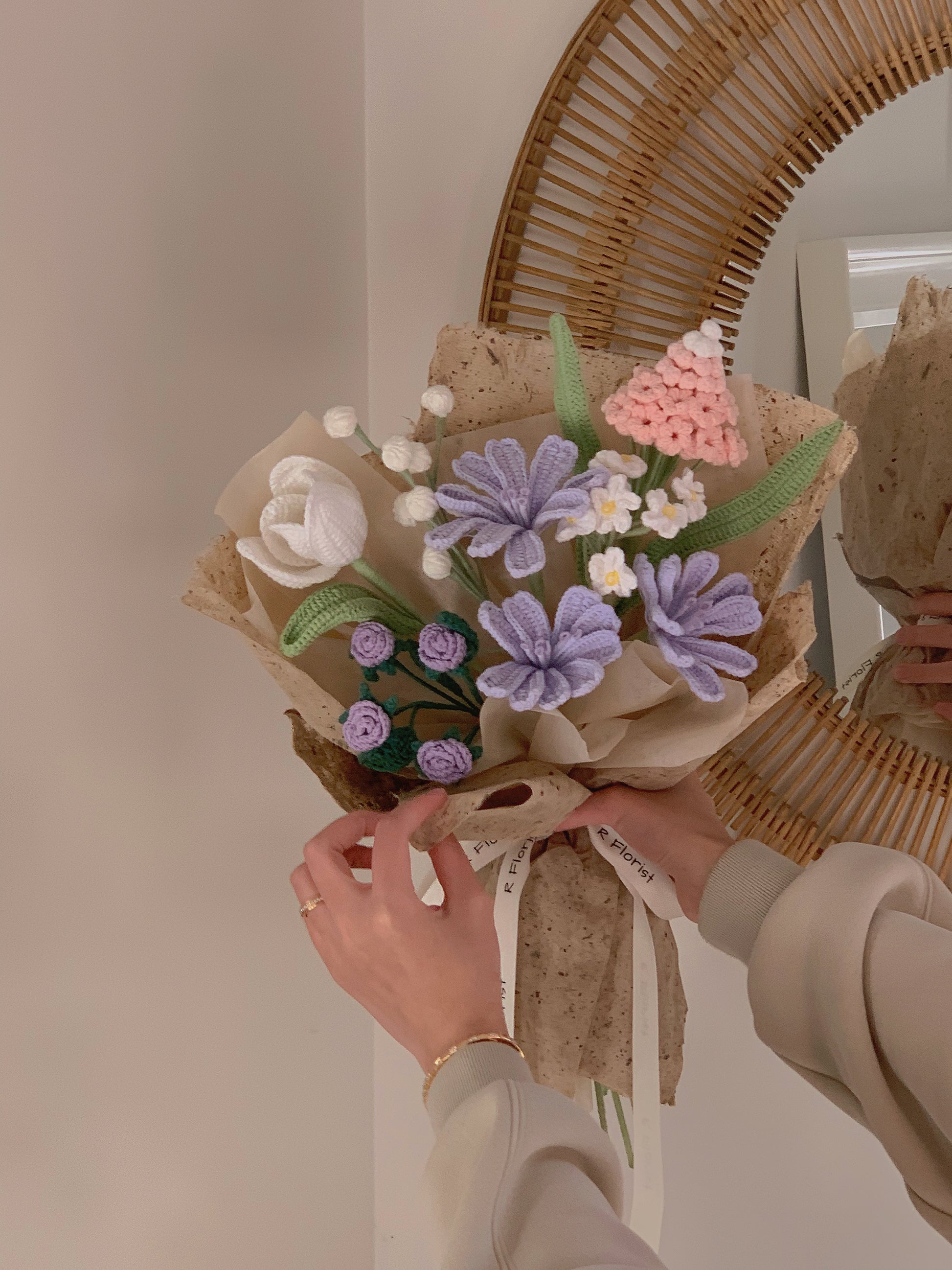 - Due to stock limits, 1-2 crocheted flowers might be out of stock and will be substituted by similar crocheted flowers. We will ensure the altered bouquet remains 80% of its original design.