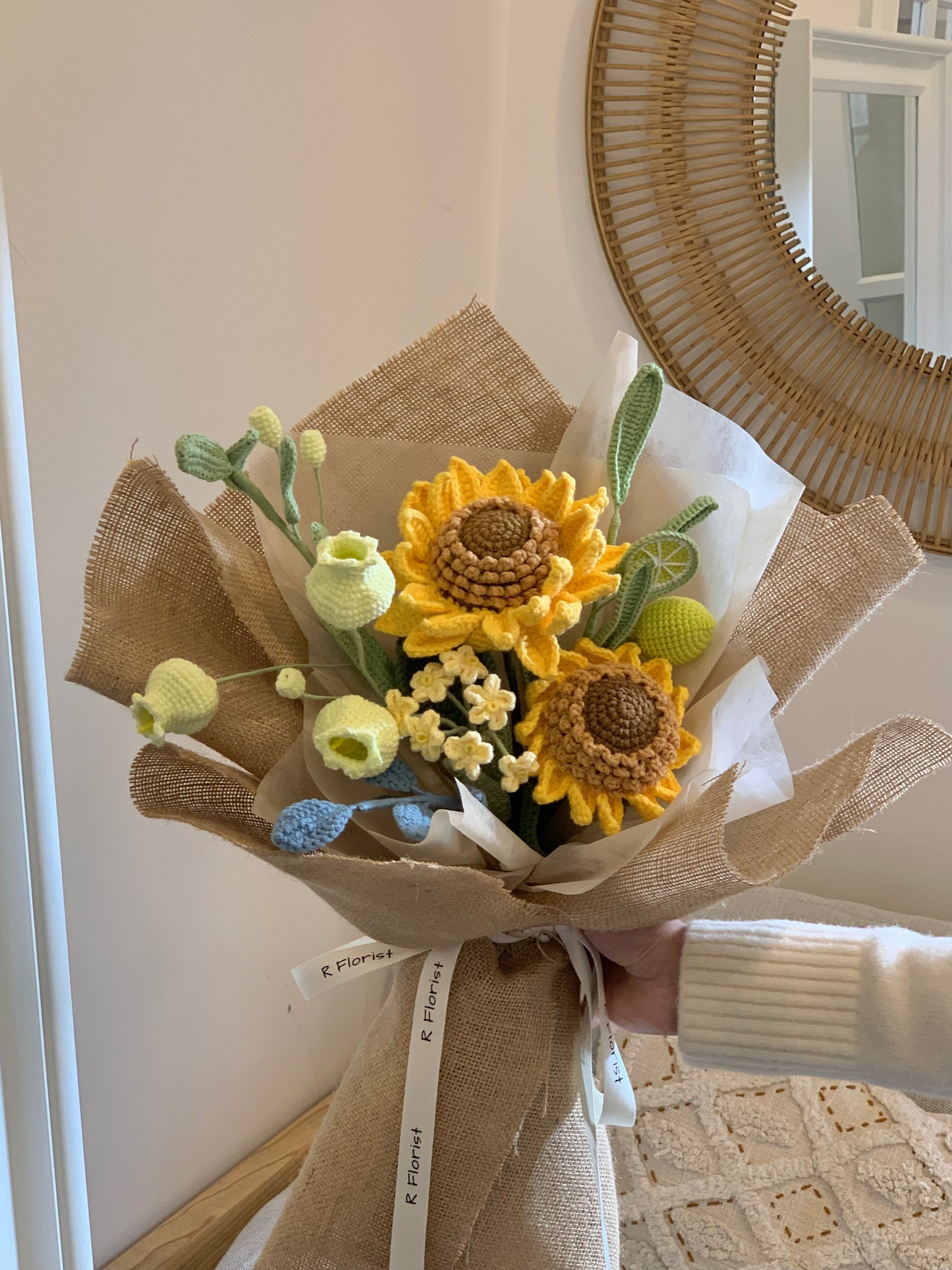 - Due to stock limits, 1-2 crocheted flowers might be out of stock and will be substituted by similar crocheted flowers. We will ensure the altered bouquet remains 80% of its original design.