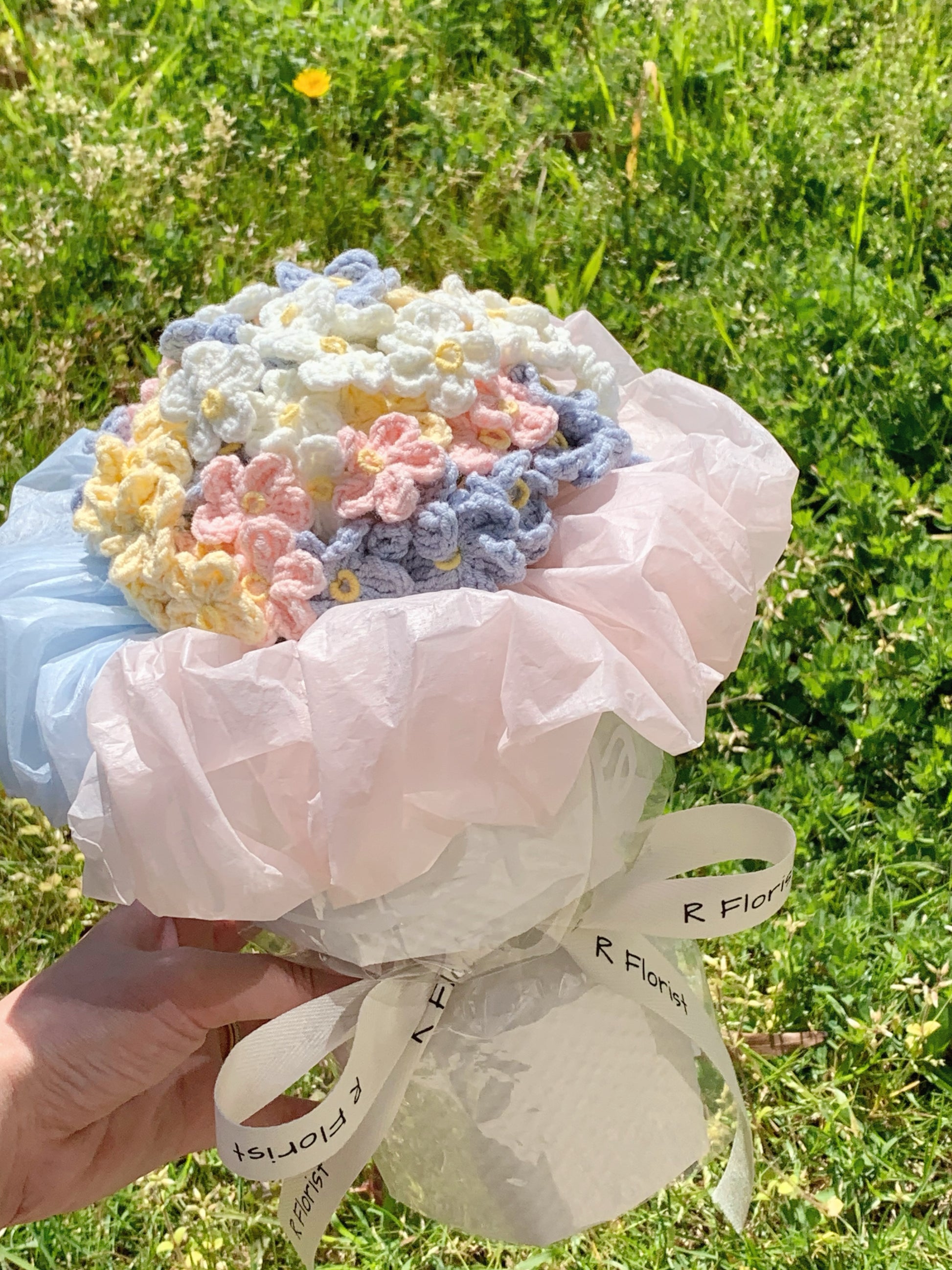 - Due to stock limits, 1-2 crocheted flowers might be out of stock and will be substituted by similar crocheted flowers. We will ensure the altered bouquet remains 80% of its original design.